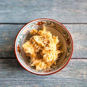 - しょうがをよく洗って、皮ごとせん切りにする。